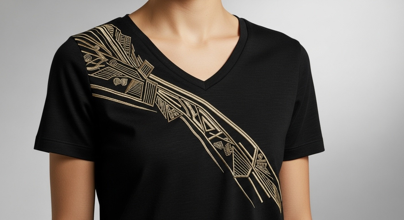 The Black Luxe V-Neck T-Shirt is a perfect blend of modern elegance and everyday comfort. Designed with a premium fabric base and accented with golden embroidered patterns, it delivers a bold yet classy style statement. Ideal for casual, semi-formal, or evening wear, this piece elevates your wardrobe effortlessly.