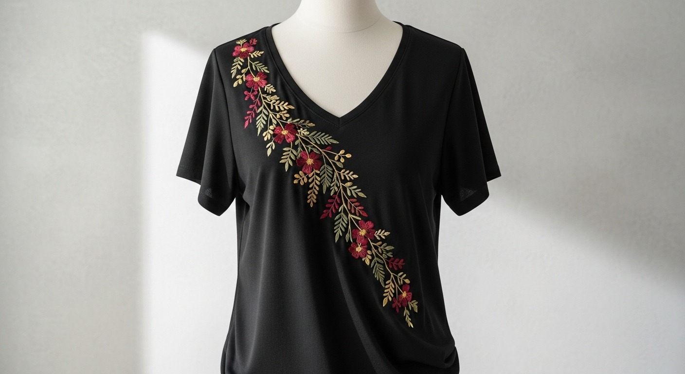 The Floral Elegance V-Neck Tee is where timeless charm meets modern style. With delicate embroidered floral patterns flowing gracefully across a soft black base, this tee adds a premium and feminine touch to your everyday wardrobe. Whether styled casually or dressed up, it’s the perfect blend of elegance and comfort.